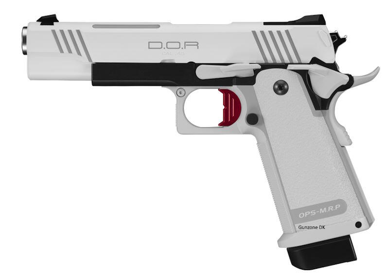 Selve pistolen kommer i en sjov dual tone med sort/hvid, og en rød aftrækker
