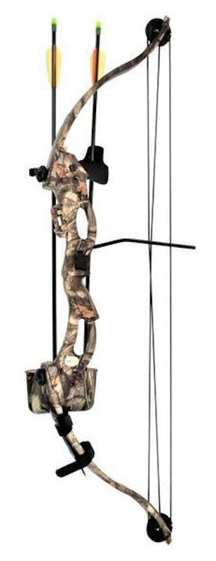 Her finder man et sæt med compound bue, 2x pile, pilekogger og meget andet til junior bueskytter.