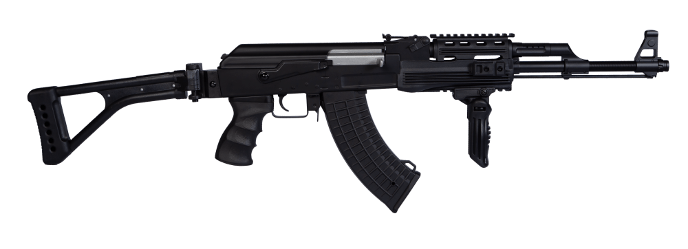 Taktisk AK47 i metal, med robust foldekolbe og frontgreb lavet af hårdt nylon, fra Cybergun.