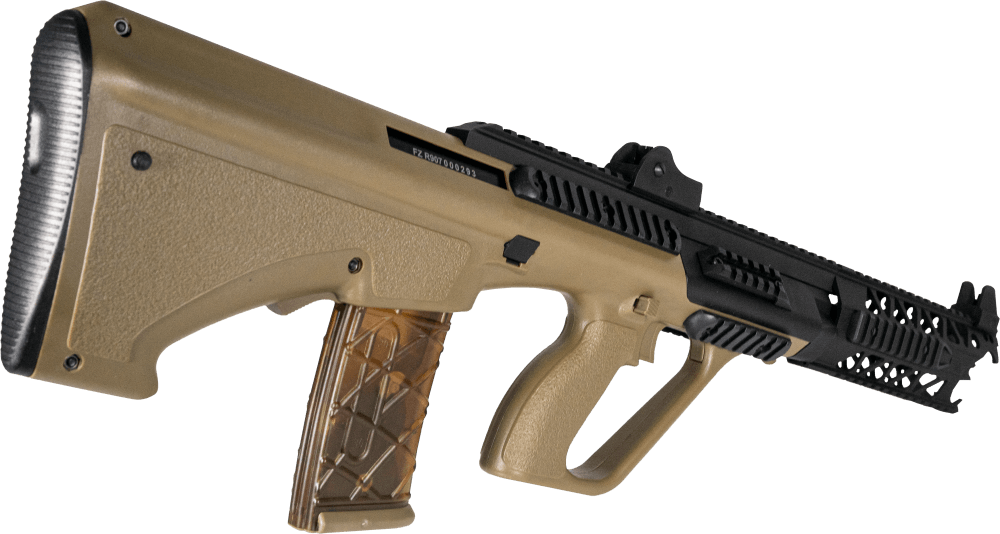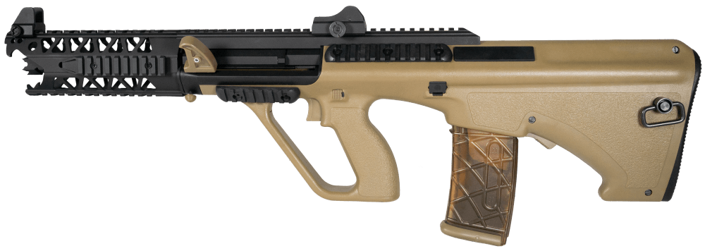 - Bullpup design med magasinet bag aftrækkeren, hvilket giver et ekstra langt løb