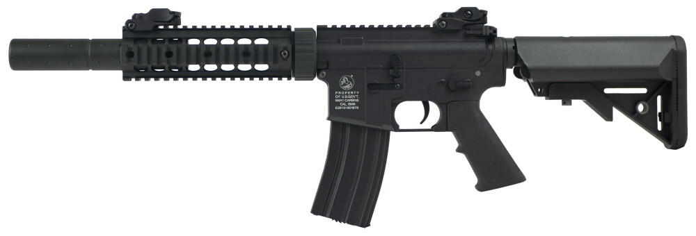 Denne korte hardball riffel er perfekt til CQB. Geværet kommer i fuld metal samt en stor lyddæmper med et langt inderløb som går ud til spidsen af lyddæmperen.