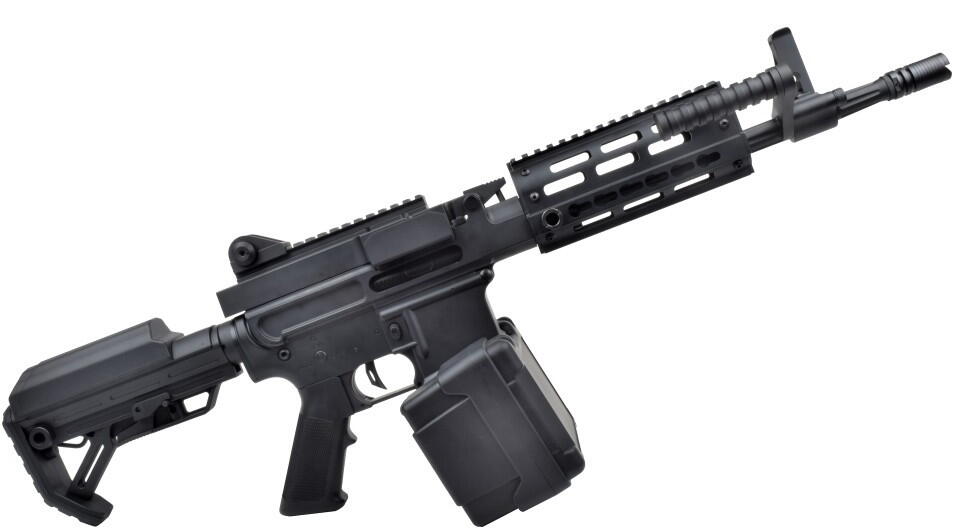 En kompakt LMG baseret på m4 platformen, hvilket gør den lækker at spille på hold med, da du kan låne dine medspilleres m4 magasiner, skulle det ske at at du tømte dine 2600 skud. Grebet og kolben kan også udskiftes hvis man vil gøre den lidt mere ergonomisk