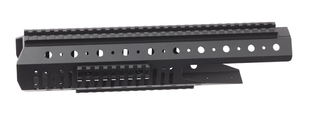 Den har en lang top rail samt en mellem rail og to små rails, der kan skrues på hvor som helst på skinnesystemet, hvilket giver mulighed for optimal placering af alt slags taktisk udstyr.