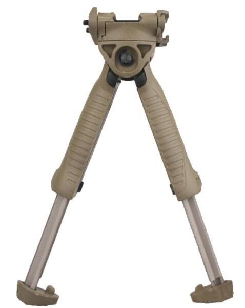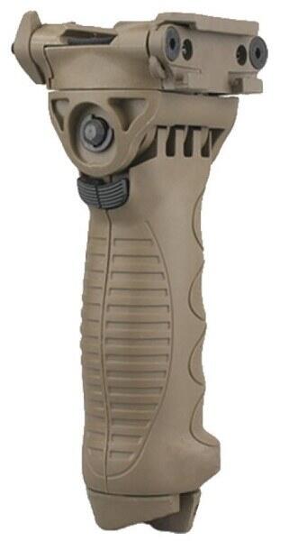 Ergonomisk polymer front greb hvor der gemmer sig en bipod indeni, der ved blot et tryk på knappen bagpå skubber grebet dens bipod ud hurtigt.
