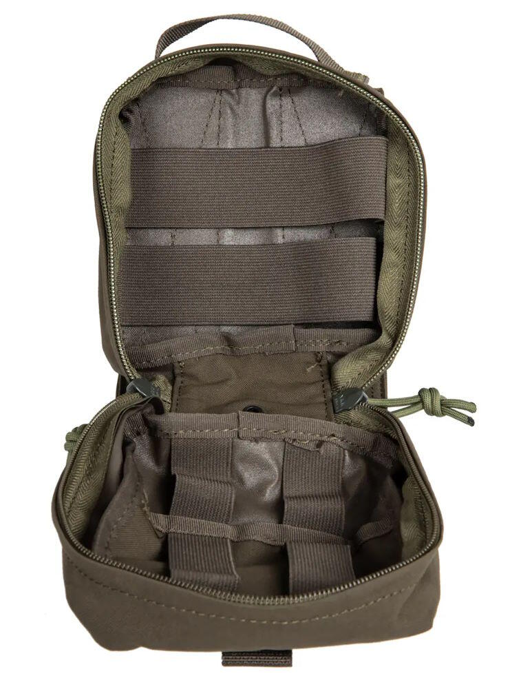 Førstehjælps lommen har et velcrolukket rum på forsiden og et hovedrum der lukkes med en to-polet YKK-lynlås. Der er elastikker i hovedrummet, som hjælper med at organisere de ting, der transporteres.