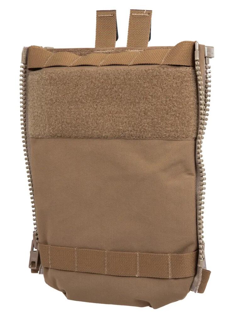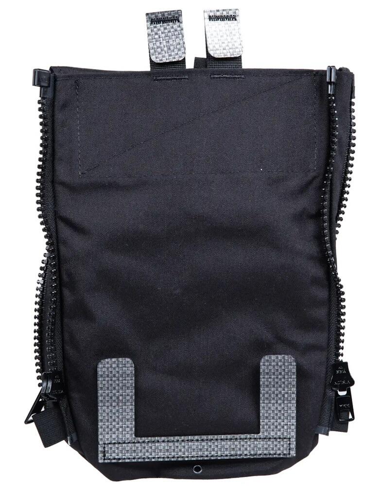 Bagsiden af panelet er udstyret med lynlåse og plastikflige, som gør det muligt at montere det på taktiske veste.