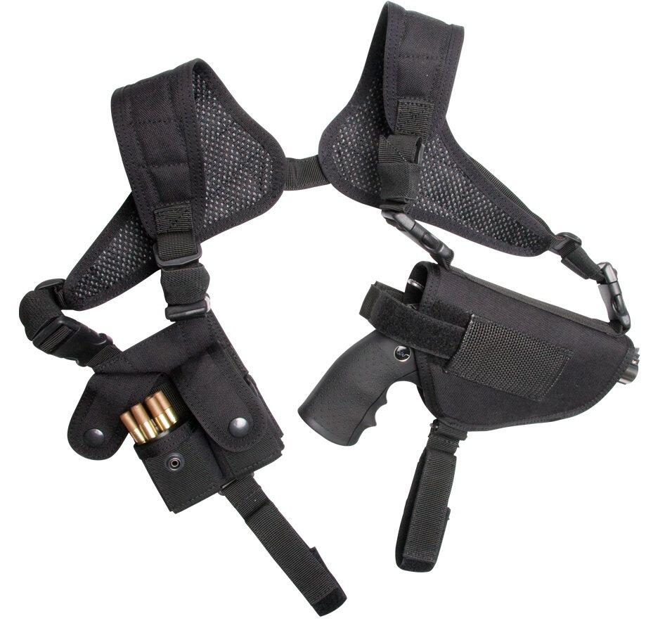 Skulderhylster til revolvere med 2 speed loader pouches. Størrelsen er fuldt justerbar, så du kan bære hylsteret skjult eller synligt. Dette hylster kan hurtigt ændres til enten venstre- eller højrehåndede spillere. Fastholdelsesstrop med trykknap klikkes op for et hurtigt træk. En ekstra sikkerhedsrem holder pistolen sikkert i hylsteret.